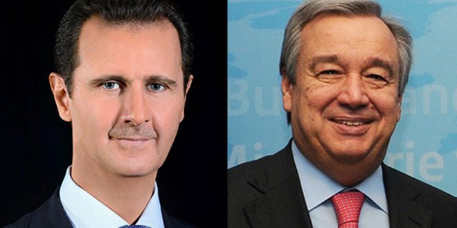 تلقى السيد الرئيس بشار الأسد برقية تهنئة من الأمين العام للأمم المتحدة أنتونيو غوتيريس بمناسبة عيد الجلاء.