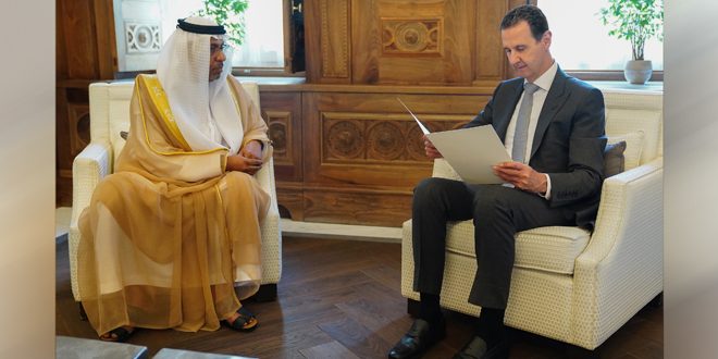 جاء ذلك خلال استقبال الرئيس الأسد يوم أمس عبد الحكيم النعيمي القائم بأعمال سفارة دولة الإمارات العربية المتحدة في دمشق والذي سلّم سيادته دعوة رسمية لحضور المؤتمر الذي سيقام في دبي ما بين الـ 30 من تشرين الثاني لغاية الـ 12 من كانون الأول المقبل.