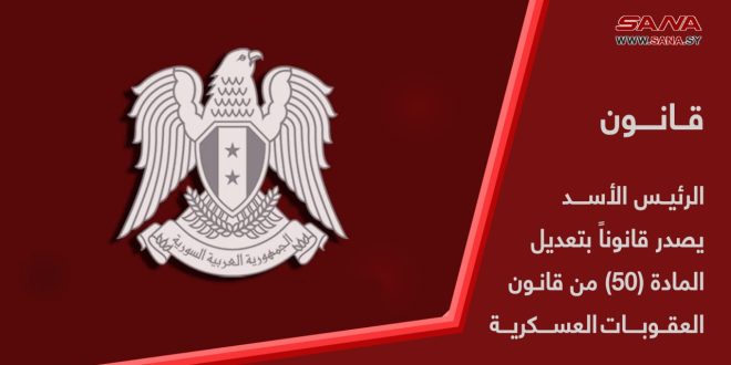 أصدر السيد الرئيس بشار الأسد اليوم القانون رقم (29) لعام 2023 القاضي بتعديل المادة (50) من قانون العقوبات وأصول المحاكمات العسكرية والذي قضى بمحاكمة المدنيين الذين تشملهم هذه المادة أمام القضاء الجزائي العادي بدلاً من القضاء العسكري إلاّ إذا كانت الجريمة ناشئة عن الوظيفة.