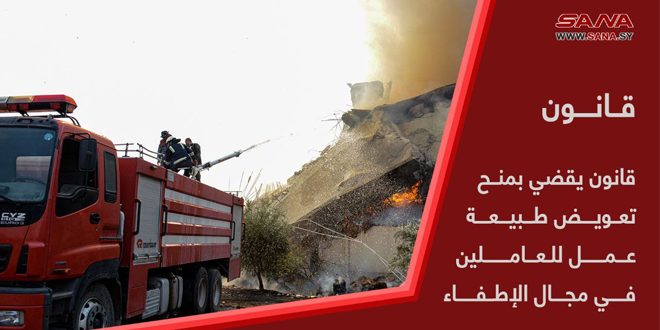 أصدر السيد الرئيس بشار الأسد القانون رقم ( 27 ) القاضي بمنح العاملين في مجال الإطفاء في الجهات العامة تعويض طبيعة عمل حده الأقصى 50 بالمئة.