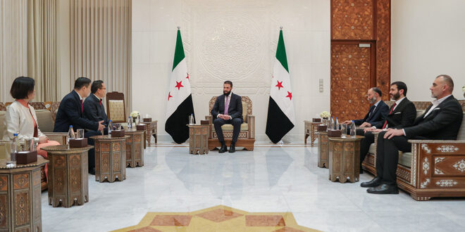التقى رئيس الجمهورية السيد أحمد الشرع يلتقي في قصر الشعب وفداً لرجال أعمال من جمهورية الصين الشعبية برئاسة السيد تشو ليجانغ المدير العام لشركة AOJ-TECHNOLOGY في منطقة الشرق الأوسط.