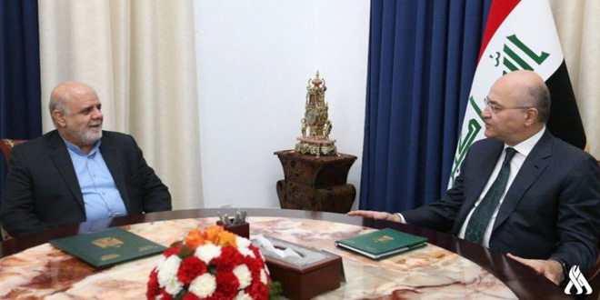 بحث الرئيس العراقي برهم صالح مع السفير الإيراني في بغداد إيرج مسجدي العلاقات الثنائية بين العراق وإيران وضرورة تطويرها.