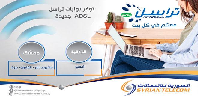 أعلنت الشركة السورية للاتصالات عن توافر بوابات إنترنت تراسل ADSL في كل من محافظتي دمشق واللاذقية.