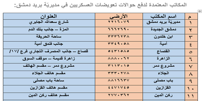 تسهيلاً لأمور العسكريين الذين تم انهاء الاحتفاظ بهم وفي ظل إجراءات الحجر الاحترازية المطبقة للتصدي لوباء كورونا أعلنت المؤسسة السورية للبريد بالتعاون مع الإدارة المالية في الجيش والقوات المسلحة أنها ستقدم خدمة دفع التعويضات والمستحقات المالية للعسكريين الذين تم إنهاء الاحتفاظ بهم بموجب الأمرين الإداريين رقم 5956/5 ورقم 8377/1 تاريخ 29-3-2020 عبر مراكزها في المحافظات.