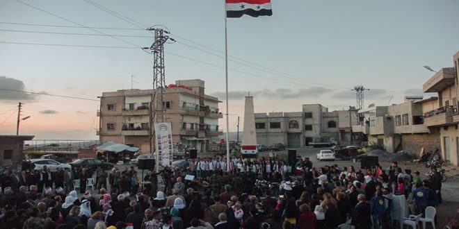 بمناسبة عيد الشهداء وتكريما لأرواحهم الطاهرة أقامت الفعاليات الأهلية والشبيبية والمنظمات الشعبية في بلدة قنوات بالسويداء اليوم حفلا وطنيا في ساحة الشهداء بعنوان “دماؤكم نور ونار” تم خلاله رفع العلم الوطني على أطول سارية بالمحافظة بارتفاع 14 مترا وقراءة الفاتحة على أرواح الشهداء الطاهرة وتقديم فقرات غنائية وطنية متنوعة.