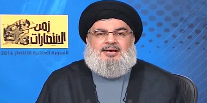 وقال نصر الله “خيارنا البقاء في الساحات وفي حلب وكل مكان يقتضيه الواجب مهما كان التهويل القائم “لافتا إلى أن حزب الله هو رأس الحربة في محور المقاومة وهذا ما يفسر محاربته عبر الأدوات الإرهابية.