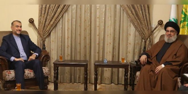 بحث الأمين العام لحزب الله السيد حسن نصر الله مع وزير الخارجية الإيراني حسين أمير عبد اللهيان والوفد المرافق الأوضاع في لبنان وفلسطين والمنطقة.