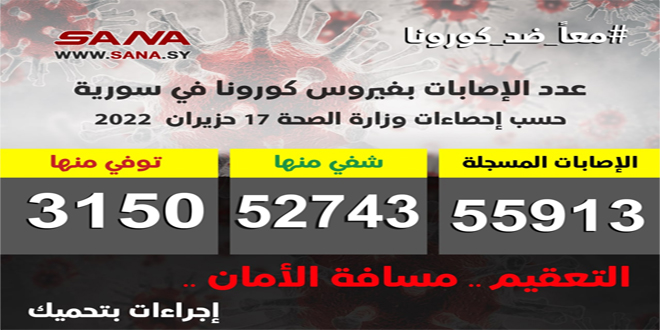 وأوضحت الوزارة في بيان تلقت سانا نسخة منه أن عدد الإصابات المسجلة في سورية بلغ حتى الآن 55913 شفيت منها 52743 حالة وتوفيت 3150 حالة.