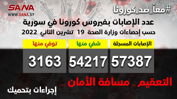 وأوضحت الوزارة في بيان تلقت سانا نسخة منه أن عدد الإصابات المسجلة في سورية بلغ حتى الآن 57387 شفيت منها 54217 حالة وتوفيت 3163 حالة.