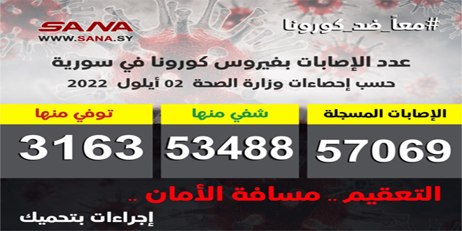 وأوضحت الوزارة في بيان تلقت سانا نسخة منه أن عدد الإصابات المسجلة في سورية بلغ حتى الآن 57069 حالة شفى منها 53488 حالة وتوفي 3163 حالة.