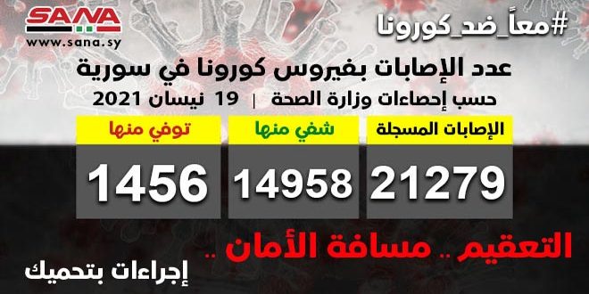 وأوضحت الوزارة في بيان تلقت سانا نسخة منه أن عدد الإصابات المسجلة في سورية بلغ حتى الآن 21279 شفيت منها 14958 وتوفيت 1456 حالة.