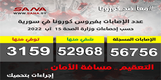 وأوضحت الوزارة في بيان تلقت سانا نسخة منه أن عدد الإصابات المسجلة في سورية بلغ حتى الآن 56756 شفي منها 52968 حالة وتوفي 3159 حالة.