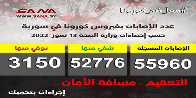 وأوضحت الوزارة في بيان تلقت سانا نسخة منه أن عدد الإصابات المسجلة في البلاد بلغ حتى الآن 55960 شفي منها 52776 حالة وتوفي 3150 حالة.