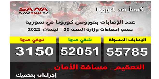 وأوضحت الوزارة في بيان تلقت سانا نسخة منه أن عدد الإصابات المسجلة في البلاد بلغ حتى الآن 55785 شفي منها 52051 حالة وتوفي 3150 حالة.