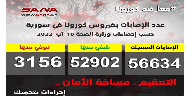 وأوضحت الوزارة في بيان تلقت سانا نسخة منه أن عدد الإصابات المسجلة في سورية بلغ حتى الآن 56634 شفي منها 52902 حالة وتوفي 3156 حالة.