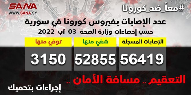 وأوضحت الوزارة في بيان تلقت سانا نسخة منه أن عدد الإصابات المسجلة في سورية بلغ حتى الآن 56419 شفي منها 52855 حالة وتوفي 3150 حالة.