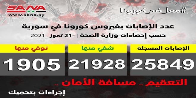 وأوضحت الوزارة في بيان تلقت سانا نسخة منه أن عدد الإصابات المسجلة في سورية بلغ حتى الآن 25849 شفيت منها 21928 وتوفيت 1905 حالات.