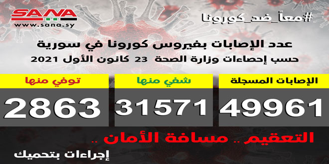 وأوضحت الوزارة في بيان تلقت سانا نسخة منه أن عدد الإصابات المسجلة في سورية بلغ حتى الآن 49961 شفيت منها 31571 حالة وتوفيت 2863 حالة.