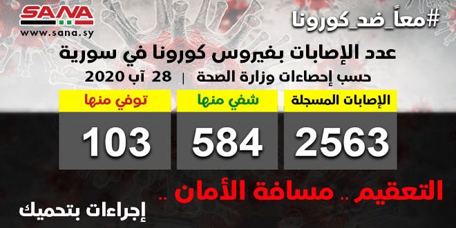 وأشارت الوزارة في بيان تلقت سانا نسخة منه اليوم إلى أن حصيلة الإصابات المسجلة في سورية حتى الآن بلغت 2563 شفيت منها 584 وتوفيت 103 حالات.