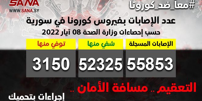 وأوضحت الوزارة في بيان تلقت سانا نسخة منه أن عدد الإصابات المسجلة في سورية بلغ حتى الآن 55853 شفيت منها 52325 حالات وتوفيت 3150 حالة.