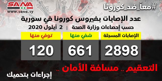 وأشارت الوزارة في بيان تلقت سانا نسخة منه اليوم إلى أن حصيلة الإصابات المسجلة في سورية حتى الآن بلغت 2898 شفيت منها 661 وتوفيت 120 حالة.