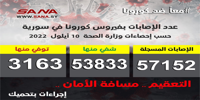 وأوضحت الوزارة في بيان تلقت سانا نسخة منه أن عدد الإصابات المسجلة في سورية بلغ حتى الآن 57152 شفيت منها 53833 حالة وتوفيت 3163 حالة.