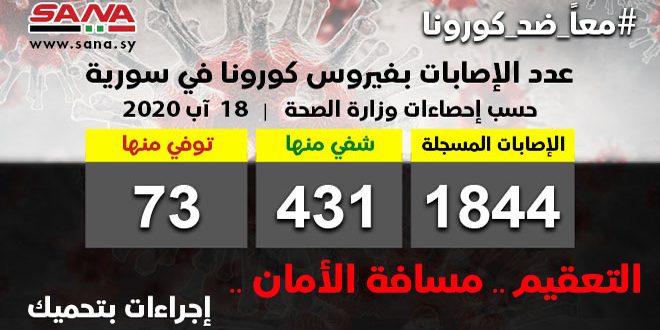 وأشارت الوزارة في بيان تلقت سانا نسخة منه اليوم إلى أن حصيلة الإصابات المسجلة في سورية بلغت حتى الآن 1844 شفيت منها 431 وتوفيت 73 حالة.
