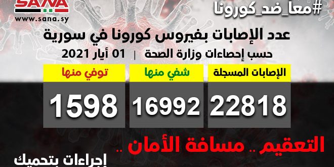 وأوضحت الوزارة في بيان تلقت سانا نسخة منه أن عدد الإصابات المسجلة في سورية بلغ حتى الآن 22818 شفيت منها 16992 وتوفيت 1598 حالة.