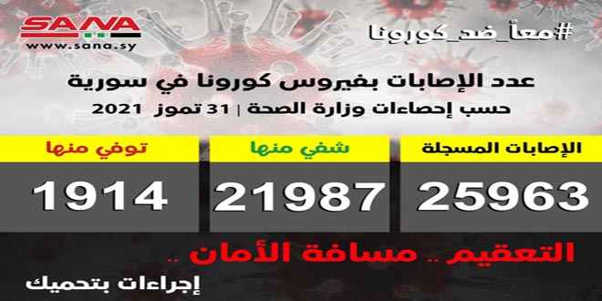 وأوضحت الوزارة في بيان تلقت سانا نسخة منه أن عدد الإصابات المسجلة في سورية بلغ حتى الآن 25963 شفيت منها 21987 وتوفيت منها 1914 حالة.