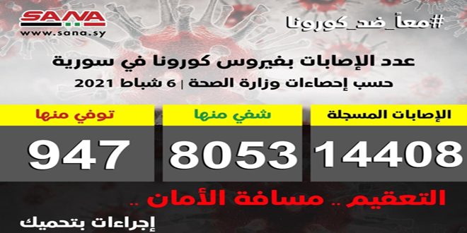وأوضحت الوزارة في بيان تلقت سانا نسخة منه أن حصيلة الإصابات المسجلة في سورية بلغت حتى الآن 14408 شفيت منها 8053 وتوفيت 947 حالة.