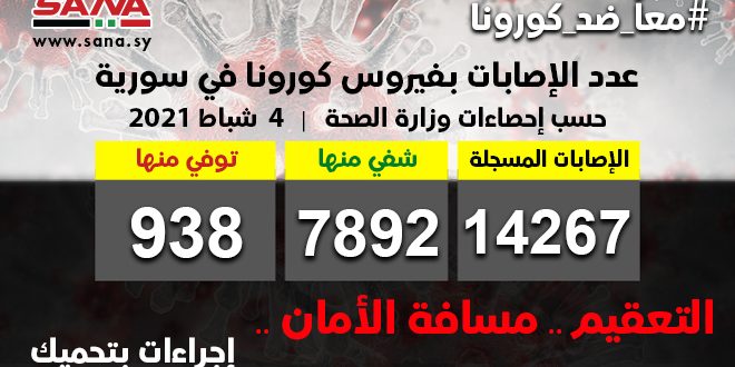 وأوضحت الوزارة في بيان تلقت سانا نسخة منه أن حصيلة الاصابات المسجلة في سورية بلغت حتى الآن 14267 شفيت منها 7892 وتوفيت 938 حالة.