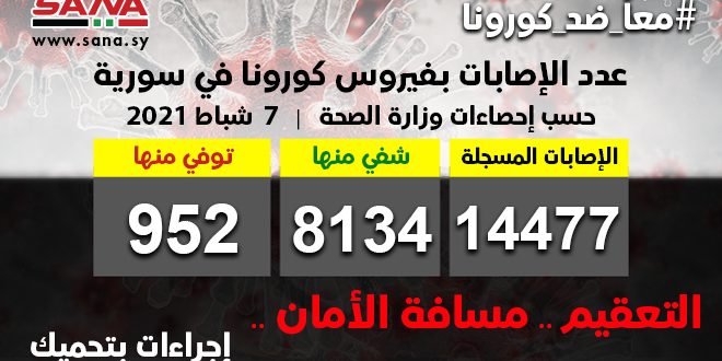 وأوضحت الوزارة في بيان تلقت سانا نسخة منه أن حصيلة الإصابات المسجلة في سورية بلغت حتى الآن 14477 شفيت منها 8134 وتوفيت 952 حالة.