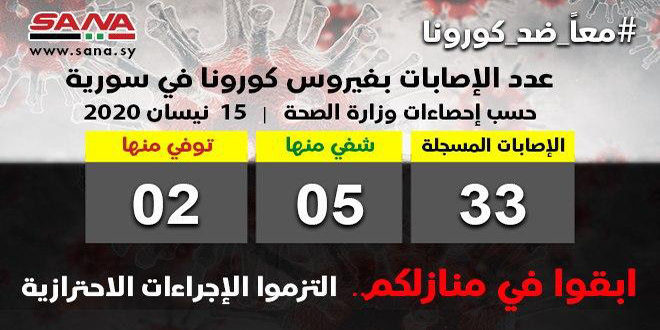 وأوضحت الوزارة في بيان تلقت سانا نسخة منه أنه تم تسجيل 4 إصابات جديدة بفيروس كورونا ليصبح عدد الإصابات المسجلة في سورية حتى اليوم 33 إصابة شفي منها 5 وتوفيت حالتان.