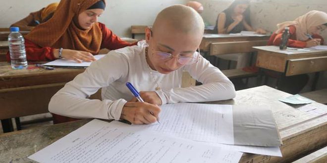 جوليت الزيني وهي من أهالي منطقة سلحب بريف حماة الغربي تقدم امتحاناتها في مركز محسن حيدر وكلها تفاؤل بمتابعة مسيرتها التعليمية ودخول الجامعة رغم ما تعانيه من آلام المرض وجرعات العلاج الكيماوي التي تخضع لها حالياً.