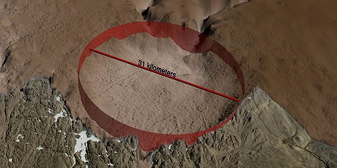 اكتشف باحثون من جامعة كنساس الامريكية حفرة نيزك عملاقة يبلغ حجمها 5 أضعاف حجم العاصمة الفرنسية باريس على عمق 800 متر تحت الجليد في غرينلاند.