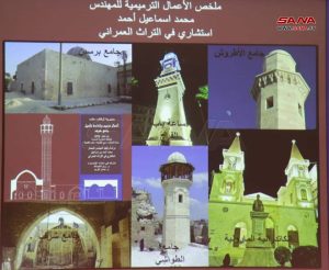 وتحدث في المحاضرة المهندس المعماري محمد إسماعيل أحمد عضو لجنة الإشراف والبحث العلمي في نقابة المهندسين بحلب عن أبنية ومساجد وكنائس حلب التي تعددت وتنوع طرازها العمراني الأموي والسلجوقي والعباسي والعثماني، وعن الأضرار التي لحقت بها وآلية العمل المتبعة في ترميمها.
