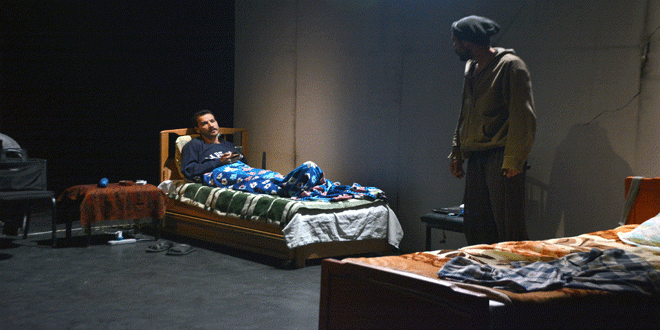 وقدمت المسرحية التي افتتحت عروضها أمس على مسرح فواز الساجر في المعهد العالي للفنون المسرحية مقطعيات من حياة قاربت الحياة الواقعية لشخصيتي الشابين خليل وسالم متكئة في ذلك على خصوصية النص الذي وضعه المسرحي البريطاني الراحل بنتر وذلك من خلال التركيز على هشاشة نفسية وترقب وخوف من المجهول والغيب والغموض الذي يكتنف الحياة اليومية في أدق تفاصيلها عبر علاقة هذين الشابين بصاحب القبو الذي يسكنان فيه وتحكمه المطلق بهما.
