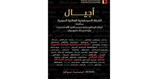 تحيي الفرقة السيمفونية الوطنية السورية بقيادة المايسترو ميساك باغبودريان عند الساعة السادسة من مساء يوم غد الخميس أمسية موسيقا كلاسيكية بعنوان “أجيال” بمشاركة عازف الكلارينيت جرجس العبدلله وعازف البيانو السوري العالمي البرفيسور غزوان الزركلي وذلك على مسرح الأوبرا بدار الأسد للثقافة والفنون.