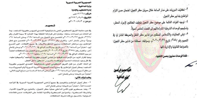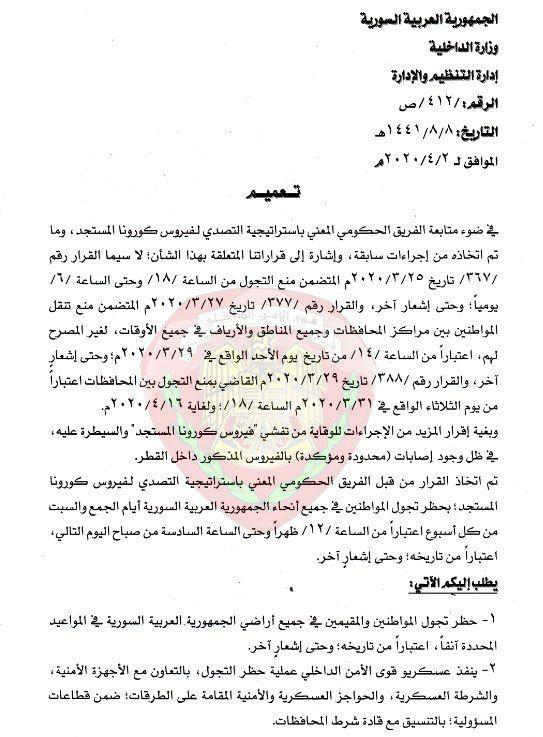 قرر الفريق الحكومي المعني باستراتيجية التصدي لوباء كورونا حظر تجوال المواطنين في جميع أنحاء سورية يومي الجمعة والسبت من كل أسبوع من الساعة الـ 12 ظهراً حتى الساعة الـ 6 من صباح اليوم التالي اعتباراً من تاريخه وحتى إشعار آخر وأصدرت وزارة الداخلية تعميما حول تنفيذ هذا الحظر.