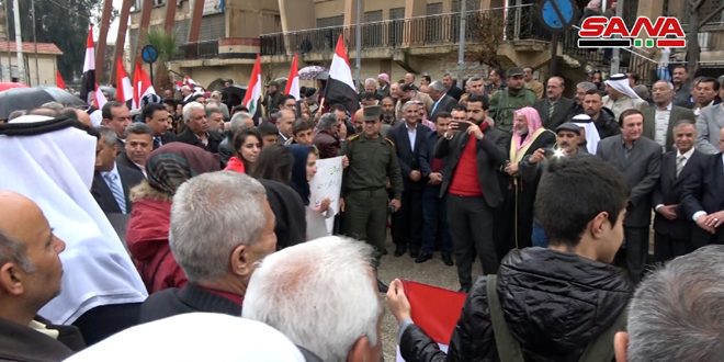 وخلال وقفة احتجاجية أمام المركز الثقافي العربي بمدينة الحسكة أشار المشاركون إلى أن سورية واجهت مختلف أصناف الاحتلال إلا أن شعبها الأبي استطاع دحرهم وتحرير أرضه وتطهيرها من رجس الطامعين وهذا ما سيحدث لكل أرض سورية محتلة ومنها الجولان العربي السوري الذي سيعود إلى أهله.
