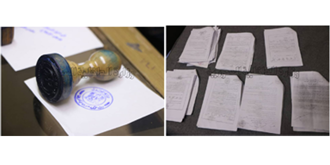 كما عثر ضمن منزله على عدد كبير من أوراق ووثائق تتعلق بمعاملات (الزواج والطلاق – صكوك زواج – دعاوى مخالعة رضائية – بيانات إثبات زواج – دعاوى إثبات زواج ونسب – دعاوى إثبات وفاة) وتم إحضاره إلى مركز الفرع وإرسال الوثائق إلى المحاكم المنسوبة إليها ليتبين بالرد أن جميعها مزورة.