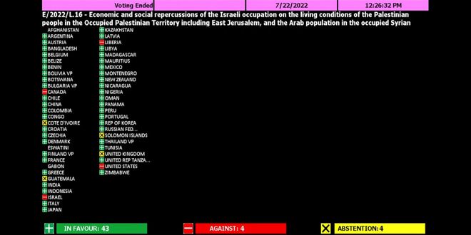 اعتمد المجلس الاقتصادي والاجتماعي في الأمم المتحدة بأغلبية ساحقة قرارين بشأن التبعات الاقتصادية والاجتماعية للاحتلال الإسرائيلي على الأرض الفلسطينية المحتلة بما في ذلك القدس وحالة المرأة الفلسطينية وتقديم المساعدة لها.