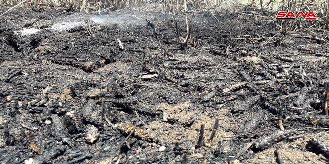 وبين المراسل أن عناصر الاطفاء بالتعاون مع الأهالي سارعوا إلى التعامل مع النيران ومحاصرتها وإخمادها لمنع امتدادها إلى حقول إضافية وبالتالي التقليل ما أمكن من الأضرار في محصول القمح والأشجار المثمرة في البساتين المجاورة نتيجة الاعتداء الإرهابي.
