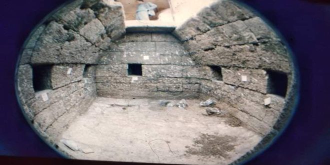 الباحث حيدر الذي ترأس بعثة التنقيب عن الموقع قبل 23 عاما ذكر في تصريح لـ سانا أنه عثر في المدفن على مدخل درج نازل وسقف على مستوى الأرض مغطى بقطع حجريه ضخمة.