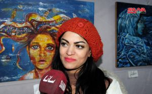 الفنانة إيمان الحسن شاركت بلوحتين من تجربتها الجديدة جسدت حلم الأنثى بالأمومة وحلمها بحياة هادئة رغم التناقضات والثانية عن جمال المرأة رغم التعب والحزن واستخدمت الزيتي والأكريليك.