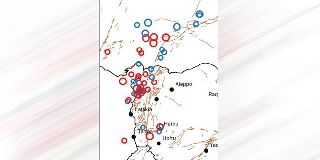 وأوضح المركز في بيان تلقت سانا نسخة منه اليوم، أن محطات الشبكة الوطنية للرصد الزلزالي سجلت هزة شمال شرق حماة بـ 6 كم بقدر 3.2 درجات على مقياس ريختر، وهزة شمال غرب حمص بـ 34 كم بقدر 3.7 ، و3 هزات في لواء إسكندرون بقدر 4.2 و3 و2.9.
