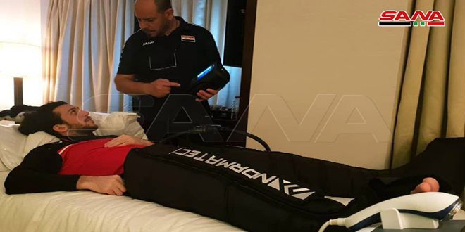 وأضاف المصري: “لدينا عيادة متنقلة للعلاج الفيزيائي وإعادة الاستشفاء بعد جهد التمارين والمباريات تتألف من أجهزة العلاج الفيزيائي (الأمواج فوق الصوتية والتيارات الكهربائية والحرارة والأشعة تحت الحمراء) وأجهزة للاستشفاء (كيم ريدي والنورمتيك الخاص بالتبريد) إضافة إلى أجهزة (قياس الضغط الدموي والنبض والحرارة وميزان لقياس الوزن ونسبة الشحوم) لافتاً إلى وجود حقائب طبية مجهزة بكل المستلزمات الاسعافية والأدوية أثناء التدريب والمباريات”.