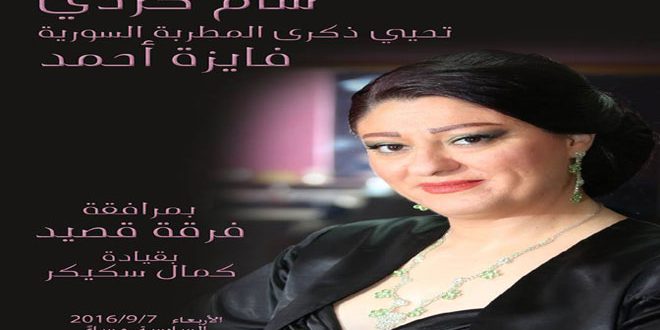 تحيي المطربة شام كردي الذكرى الثالثة والثلاثين لرحيل المطربة السورية الكبيرة فايزة أحمد في حفل غنائي بمرافقة فرقة قصيد بقيادة المايسترو كمال سكيكر عند السادسة من مساء الأربعاء المقبل على خشبة مسرح الاوبرا في دار الاسد للثقافة والفنون بدمشق.