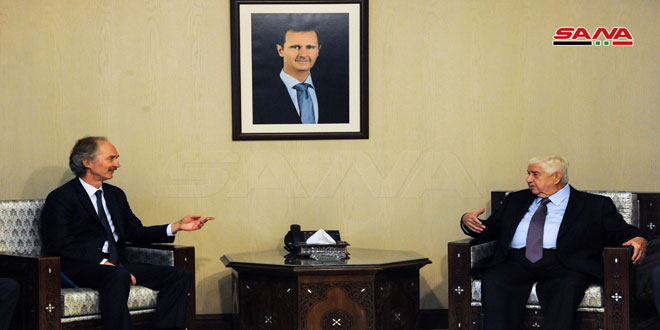 من جهته قدم المبعوث الخاص إلى سورية عرضا للوزير المعلم حول نتائج لقاءاته واتصالاته التي أجراها خلال الفترة الماضية بشأن سورية وأيضا بشأن الانطلاق بعمل لجنة مناقشة الدستور معربا عن استعداده لبذل كل ما يطلب منه في إطار مهامه المحددة وفق قواعد وإجراءات عمل اللجنة المتفق عليها.
