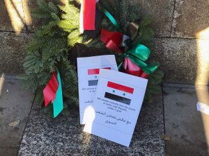 بعد ذلك قام سماحة المفتي حسون و البطريرك لحام والوفد المرافق وعدد من المحاربين الايرلنديين القدماء بوضع اكاليل من الزهور في مكان التفجير الإرهابي الذي استهدف ايرلندا وذهب ضحيته عدد من المواطنين الايرلنديين في تأكيد على أن الإرهاب الذي يضرب أنحاء العالم إنما هو إرهاب واحد.. وأن الشعب السوري اليوم بدفاعه عن وطنه يدافع عن الإنسانية بأسرها.